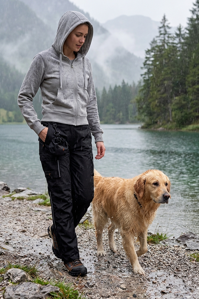 Wasserdicht (verschweißte Nähte, 8.000MM), atmungsaktiv und winddicht. Natürlich mit dem Leckerlibeutel und vielen Taschen.
