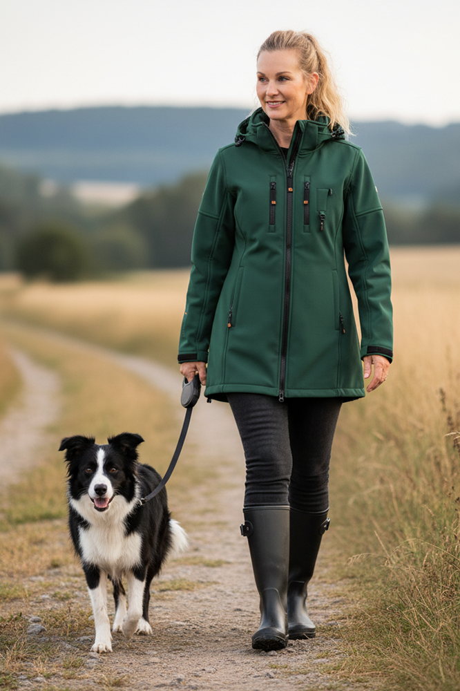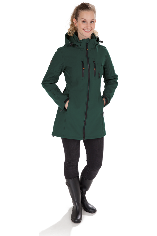 Hochfunktionale Damen Softshelllangjacke mit abtrennbarer Kapuze, wasserabweisend, atmungsaktiv, winddicht.